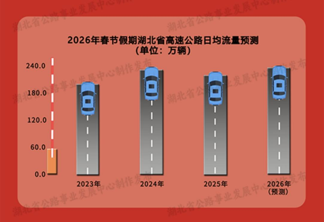 根据历年来春节假期车流规律分析,预判2026年春节假期高速公路通行车辆日均出口流量约235万辆,较2025年同期(216.90万辆)增长约8.3%,约为平日流量的2倍。