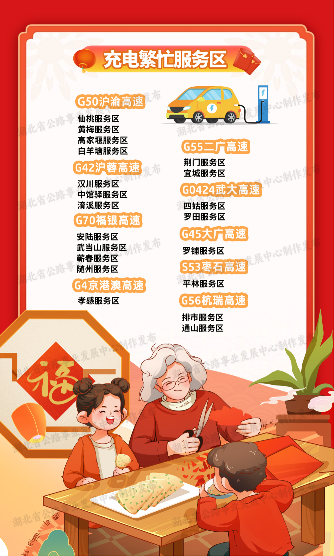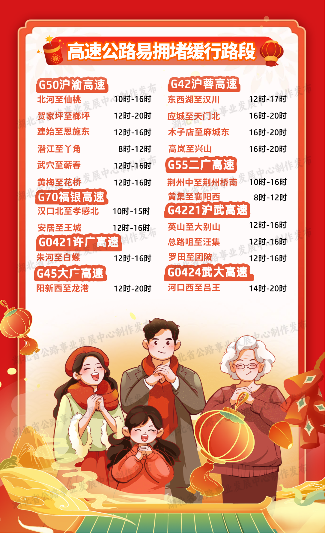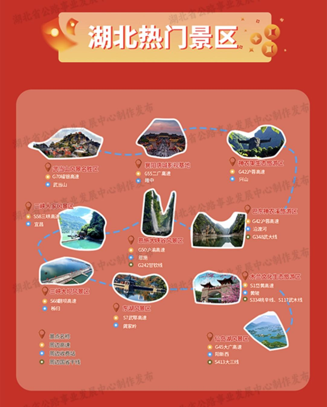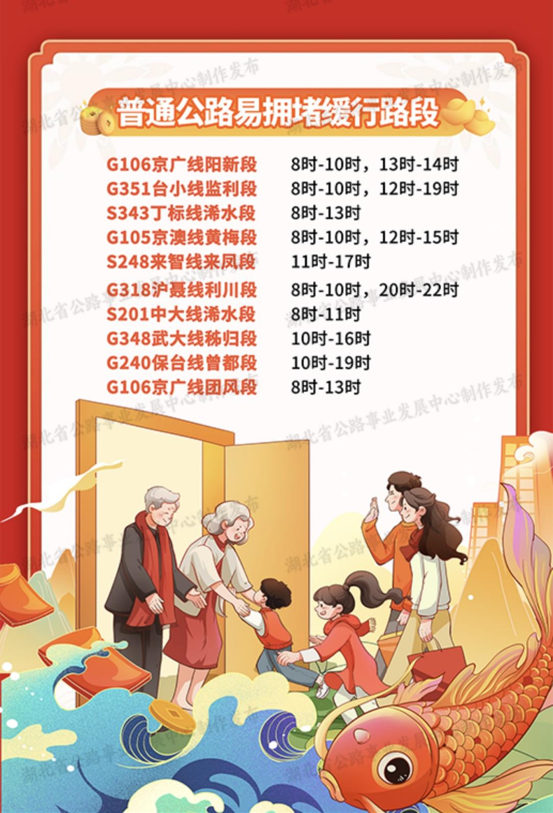 湖北省公路事业发展中心根据拥堵缓行监测数据分析,预计春节假期干线公路出入城路口、枢纽互通、服务区等区域易出现不同程度的拥堵缓行,主要集中在国省干线及武汉市周边路段。