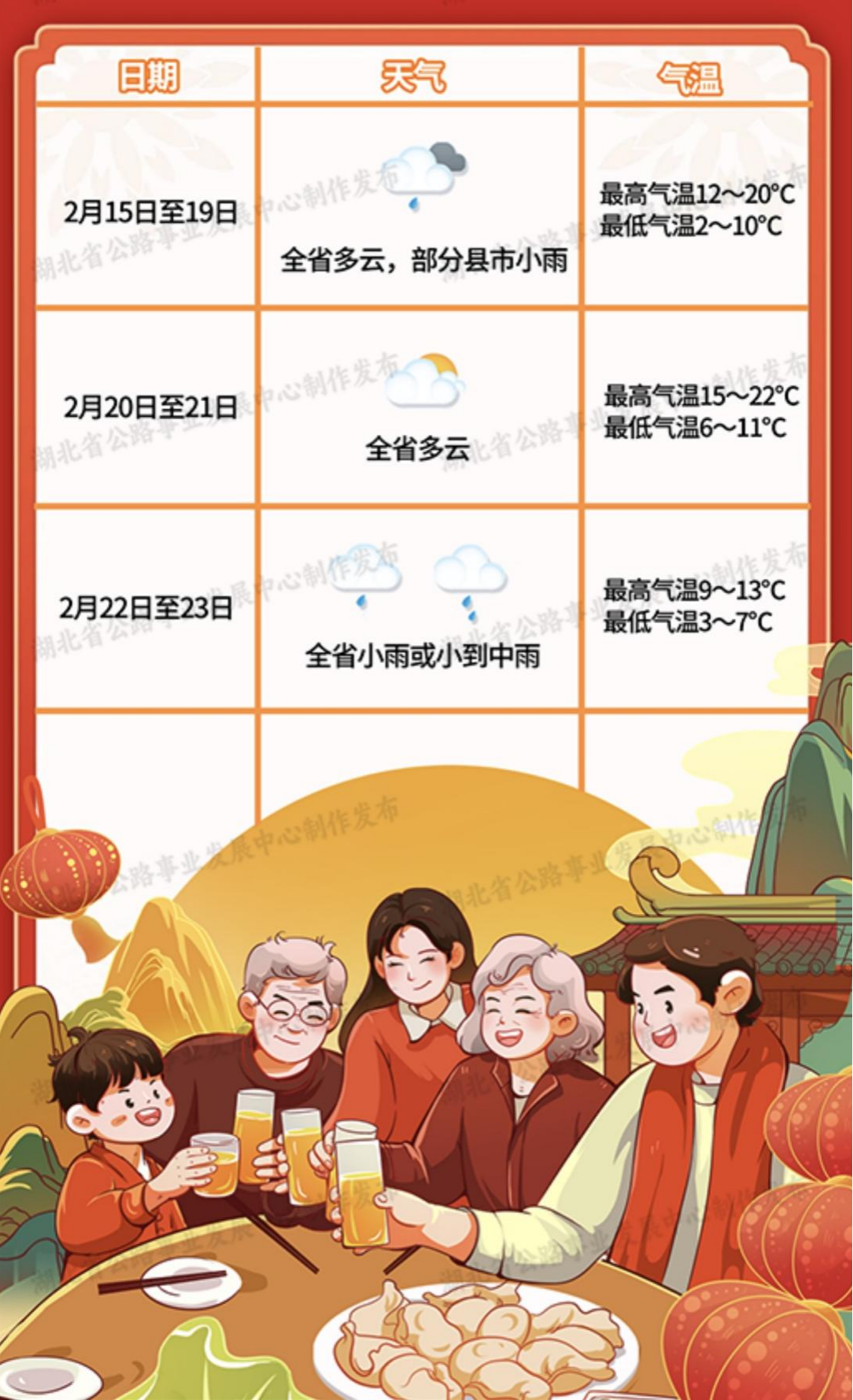 经与省气象服务中心会商研判,预计2026年春节假期期间(2月15日至2月23日),全省气温大部偏高;天气前期以多云为主,16日前后部分县市有小雨,后期有一次较明显的降水降温天气过程,对节后返程有一定不利影响。