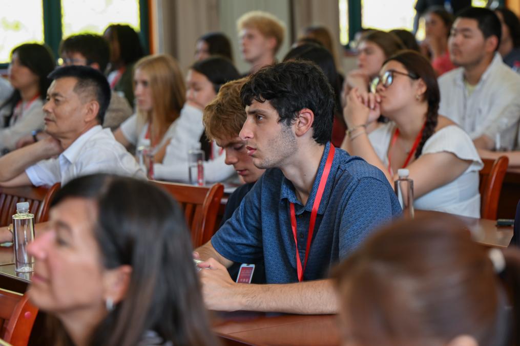 2025年7月28日,在湖北省黄冈市红安县,美国飞虎队夏令营代表团成员观看纪录片《飞虎情缘》。新华社记者 杜子璇 摄