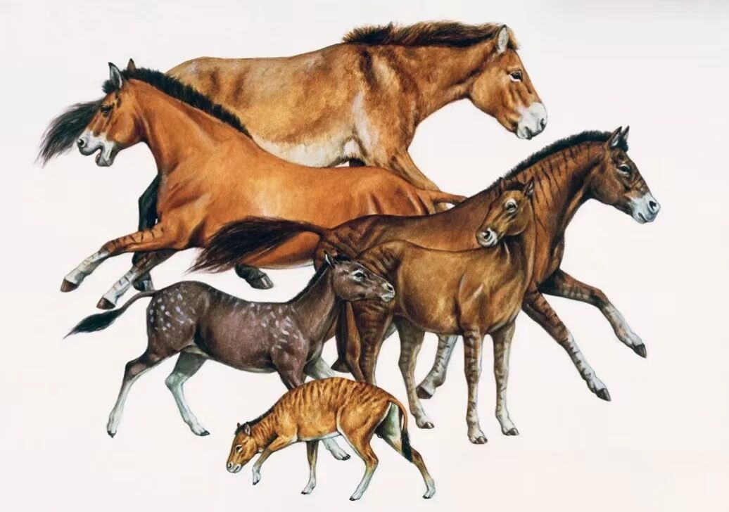 马的进化,从下到上依次为始马(Hyracotherium)、渐新马(Mesohippus)、中新马(Miohippus)、草原古马(Merychippus)、上新马(Pliohippus)以及现代马(Equus caballus)复原图