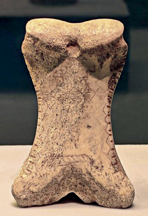 哈萨克斯坦北部波泰遗址出土的第1节马趾骨,上面刻画有几何纹饰。野马最早在这里得到驯化