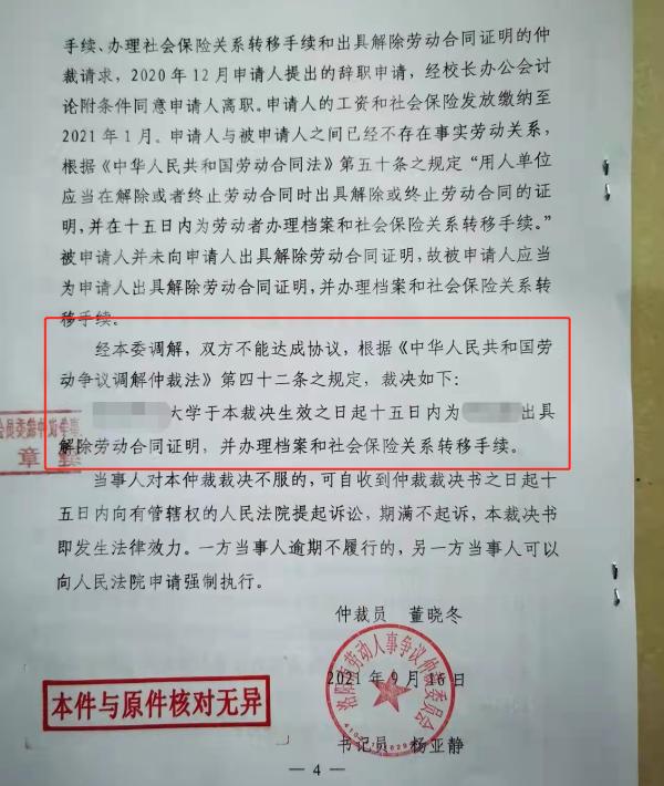 9月16日,仲裁委裁决如下:该校于本裁决生效之日起十五日内为其出具解除劳动合同证明,并办理档案和社会保险关系转移手续。周寻称,学校未执行该裁决,并向法院申请撤销裁决。