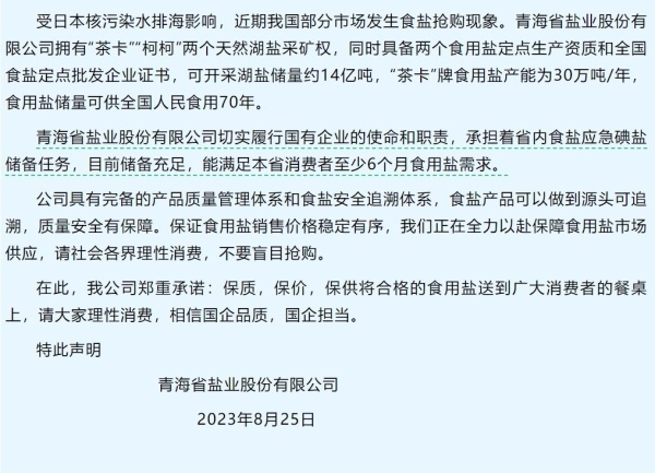 8月25日,青海省盐业股份有限公司发布声明称,该公司拥有“茶卡”“柯柯”两个天然湖盐采矿权,同时具备两个食用盐定点生产资质和全国食盐定点批发企业证书,可开采湖盐储量约14亿吨,“茶卡”牌食用盐产能为30万吨/年,食用盐储量可供全国人民食用70年。