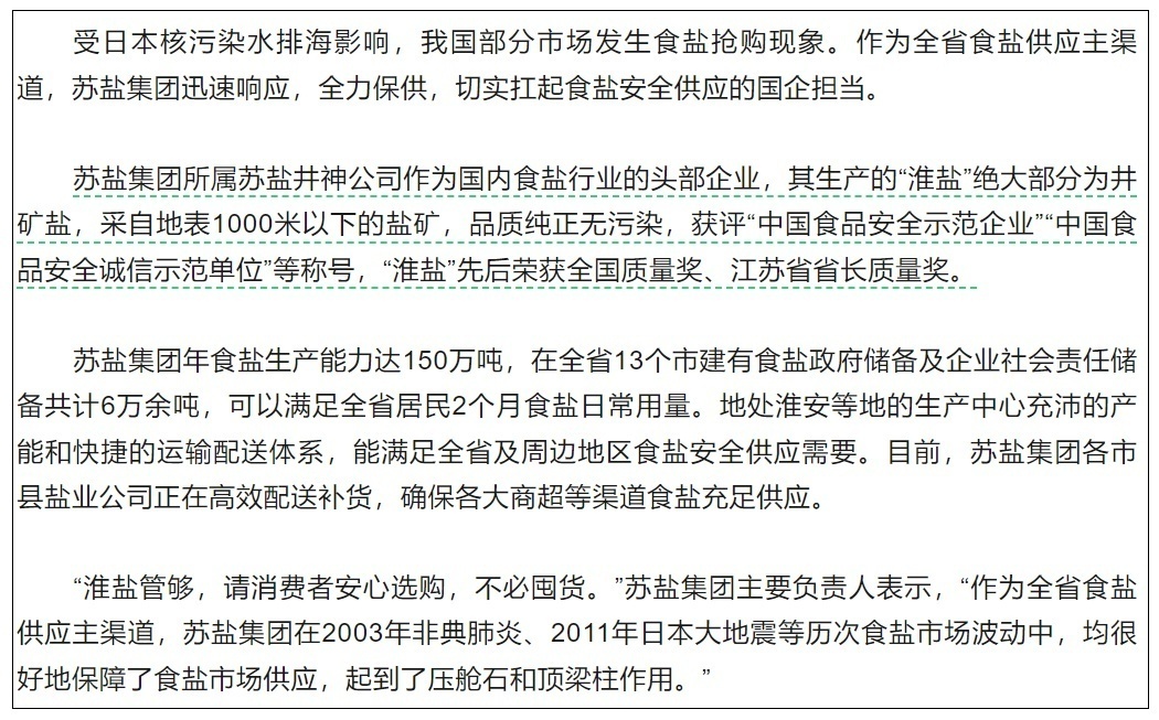 24日,中盐集团发布关于保障食盐市场供应的声明称,当前我国的食盐产品结构占比为井矿盐87%、海盐10%、湖盐3%,井矿盐和湖盐生产均不受日本核污染影响。中盐集团是世界最大的食盐生产企业,食盐产能超过1000万吨/年,食盐储备供应充足。呼吁社会各界理性消费,不要盲目抢购。