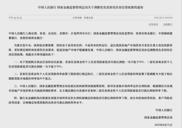 8月31日晚间,中国人民银行、国家金融监督管理总局联合发布《关于调整优化差别化住房信贷政策的通知》和《关于降低存量首套住房贷款利率有关事项的通知》。