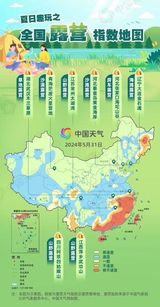 全国露营指数地图显示,未来三天(5月31日至6月2日),我国北方大部天气晴朗,适宜进行露营活动。但在南方不少地方可能有雨水出没,需关注天气情况,雨势较强地区不宜露营。